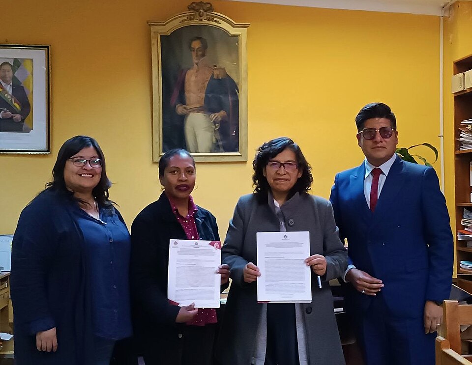 Firma del Acuerdo de Cooperación Interinstitucional entre los representantes de la ESFM Simón Bolívar, Wikimedistas de Bolivia y CADIC en julio de 2025. Photo: Julia WM Bo, CC BY-SA 4.0